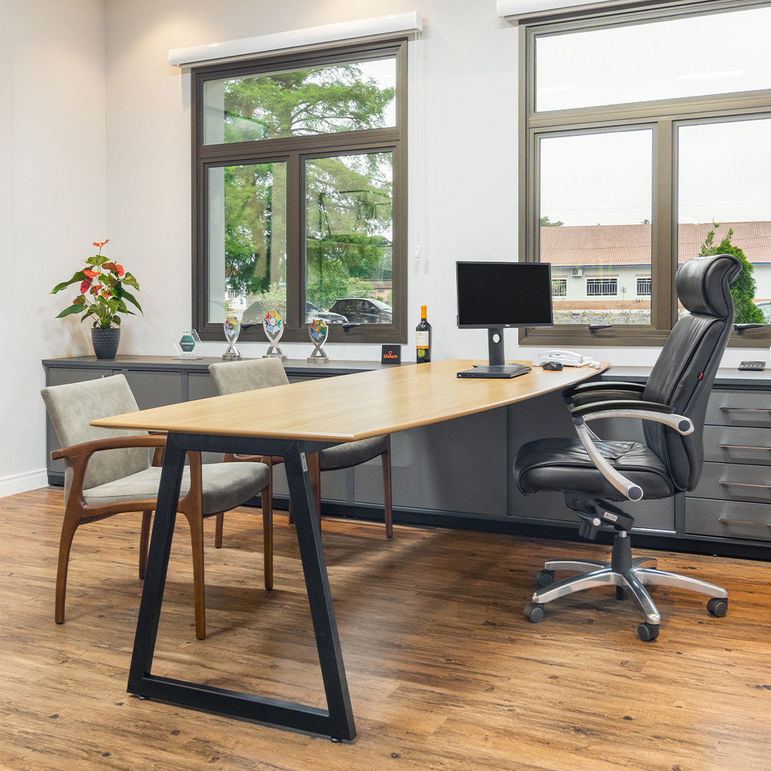 Mesas com layouts versáteis e proporções ideais para reuniões produtivas e ambientes executivos.
