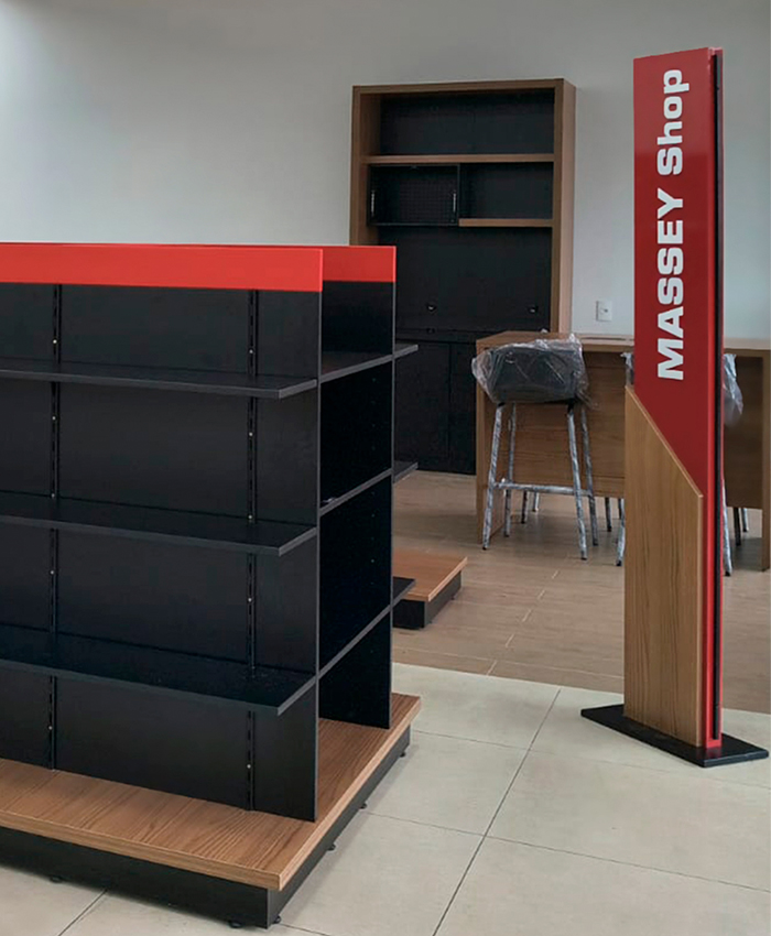A composição entre estrutura metálica, painéis em madeira e elementos em destaque na cor institucional reforça a presença da marca no ambiente, criando um espaço alinhado à força e tradição da Massey Ferguson. Cada detalhe foi pensado para oferecer praticidade, estabilidade e eficiência operacional, sem abrir mão de uma estética limpa e contemporânea.