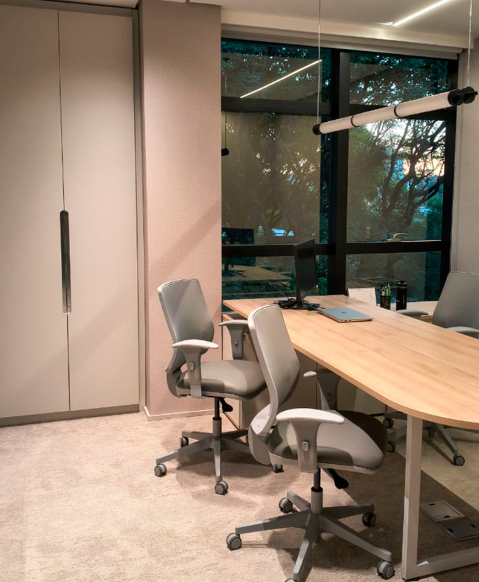 A GMOBILI desenvolveu soluções de mobiliário corporativo que equilibram acabamento refinado, ergonomia e alta funcionalidade.
